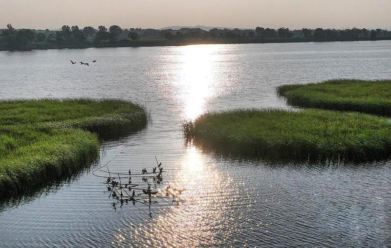 6月20日,一群水鸟在芦河栖息(无人机照片)。
