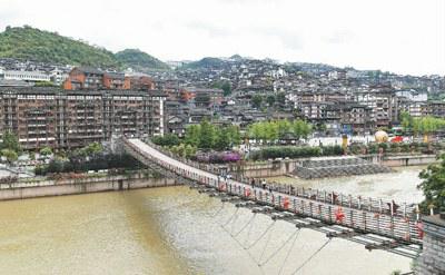 游客在贵州省仁怀市茅台镇茅台渡口铁索桥上参观,缅怀革命先烈,重温光辉历史,接受爱国主义教育。陈勇 摄