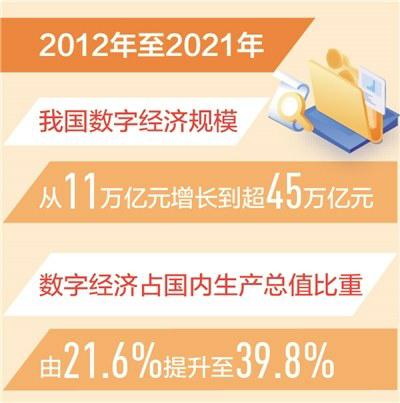 记者近日从工业和信息化部获悉:近年来,我国数字经济蓬勃发展,产业规模持续快速增长,已数年稳居世界第二。统计测算数据显示,从2012年至2021年,我国数字经济规模从11万亿元增长到超45万亿元,数字经济占国内生产总值比重由21.6%提升至39.8%。