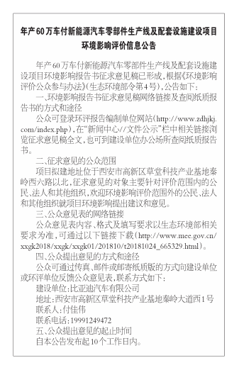 年产60万车付新能源汽车零部件生产线及配套设施建设项目环境影响评价信息公告