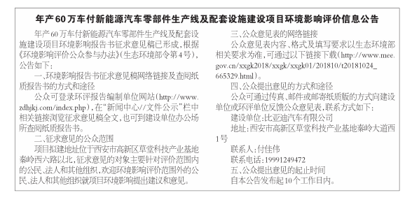 年产60万车付新能源汽车零部件生产线及配套设施建设项目环境影响评价信息公告