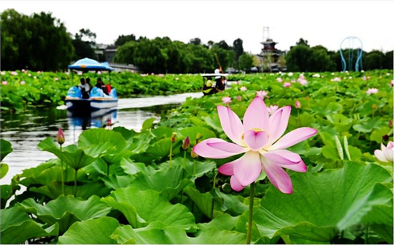 近日,秦岭深处的陕西省商洛市丹凤县棣花古镇荷花盛开,吸引游人前来观赏。图为游人乘船在棣花古镇的荷塘观赏荷花。