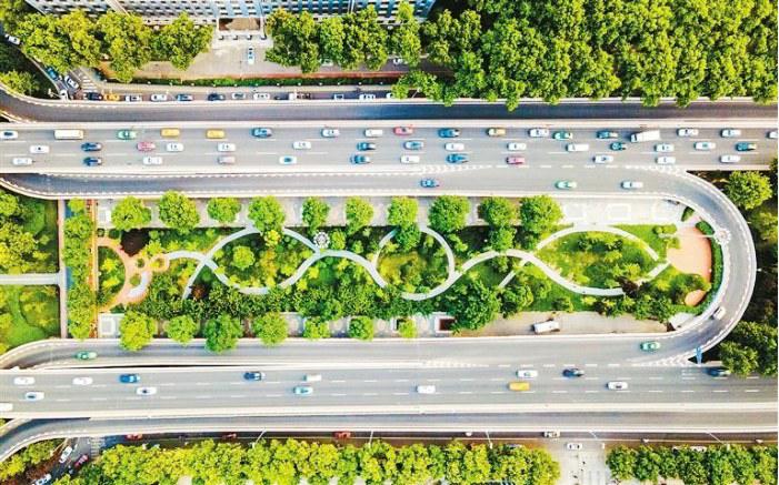 7月27日,无人机视角下的西安市南二环太白立交街心公园。精心种植的花草树木,在往来的车流中增添了许多绿色,让城市变得更加生机盎然。