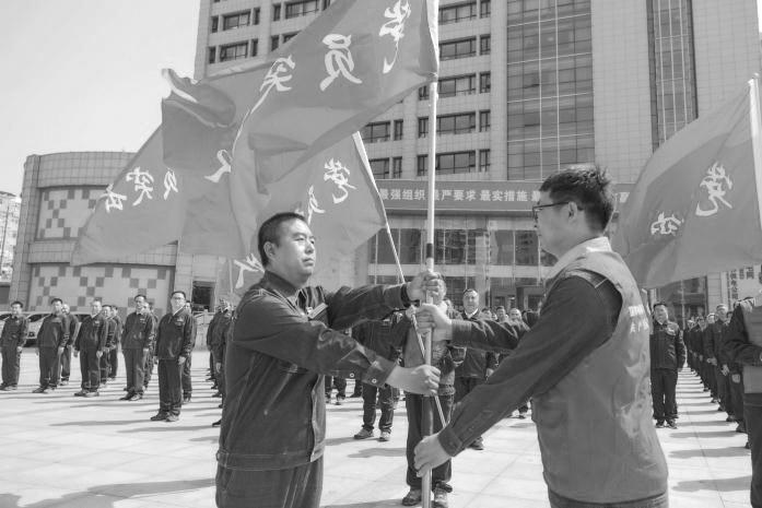 8月1日,国网榆林供电公司举行升国旗仪式暨省十七运保电誓师大会,庆祝公司融合发展一周年,动员和激励公司全体干部职工增强爱国爱企情怀,凝心聚力推动公司和电网发展上台阶,全力以赴打赢省十七运保电攻坚战,以实际行动迎接党的二十大胜利召开。图为国网榆林供电公司负责人向神木公司战区授旗。
