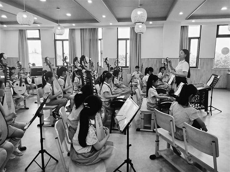 沣西新城文教园第一小学学生正在老师的指导下演奏乐曲