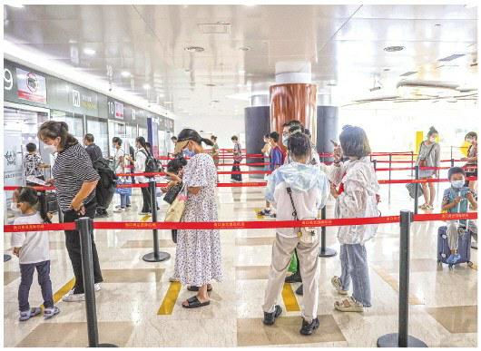 8月14日,返程旅客在海口美兰机场候机楼内排队准备接受安检。张丽芸 摄