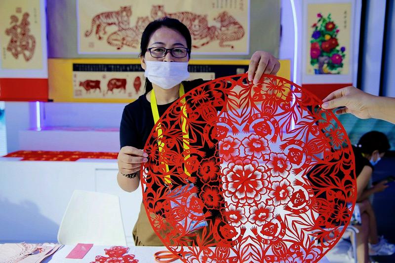 第六届丝博会陕西馆内,一幅幅主题新颖、制作精巧的剪纸作品在非遗传承人侯志萍手中精彩呈现,引得不少人驻足观赏。