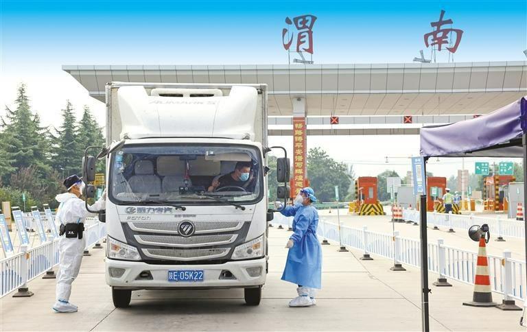 8月20日,在连霍高速公路渭南东出口,防疫人员对司乘人员严格落实查验健康码、大数据行程卡等防疫措施。母家亮 摄