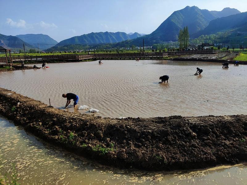 汉中市当地藕种单价高,又缺少劳力采挖,外地的藕种因为疫情影响,运输时限得不到保障。面对藕种供应难题,王军红多方联系,并自掏腰包垫付定金。1.5万棵藕种从江苏省发货,仅3天时间就运输到位。签订流转协议、丈量土地、组织机械平地开渠……不到1周时间,一个占地50亩的“渔藕连作”基地就基本建成。