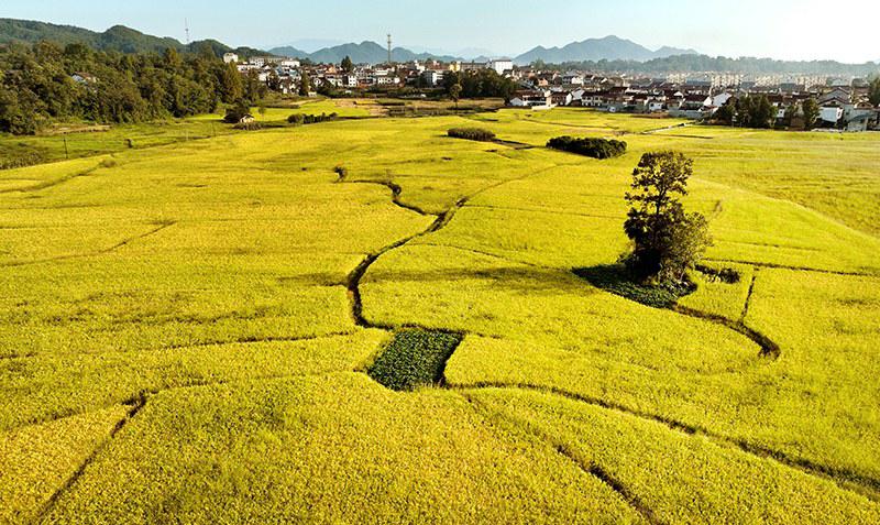 近日,陕西省汉中市南郑区的广阔田野满眼金黄,随处可见丰收景色。多年来,当地政府科学合理利用耕地资源,强化粮食功能区管护,建成旱涝保收高标准农田,保障以水稻为主要粮食作物的种植面积稳定在27.5万亩,大力实施“良种工程”和水稻提质增产扩能示范工程项目,落实水稻绿色高质高效栽培技术,主要粮食产量稳中有增。图为9月5日拍摄的汉中市南郑区黄官镇武营村丰收在望的优质晚熟水稻田(无人机照片)。