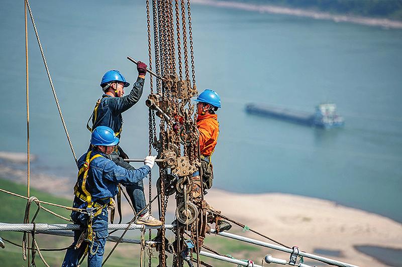 9月13日,工人在白鹤滩-浙江±800千伏特高压直流输电线路工程(重庆段)江津长江大跨越施工现场作业。