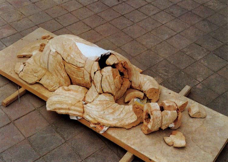 选取颜色、质地、厚度相当的陶片放在一起,按接茬顺序连接后,令人大吃一惊。一个新奇的、没有见过的大陶俑映入眼帘,尽管他身体破碎、伤痕累累,但是昂首、匍匐的姿势已经基本确定。