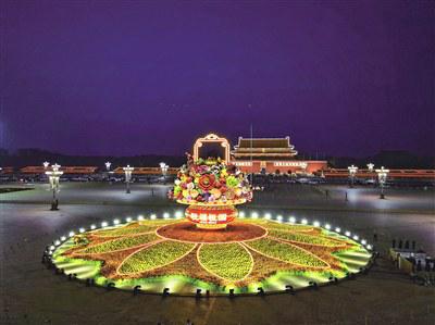 天安门广场“祝福祖国”巨型花果篮和长安街沿线14个花坛已经完工,9月25日正式亮相,9月26日晚开启“夜景灯光模式”。