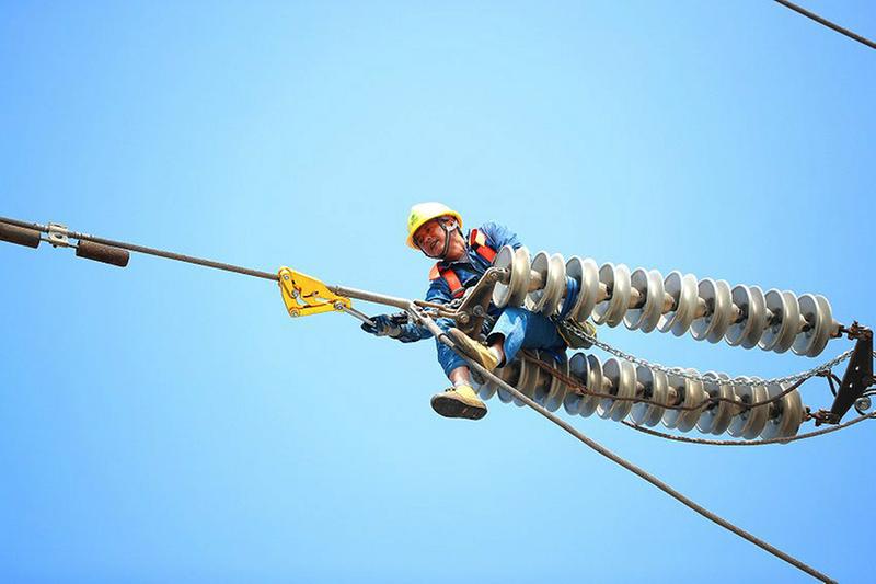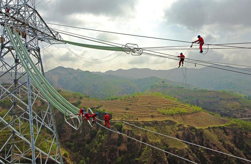 检修人员对±800kV陕武线路实施挂设导线工序。国网陕西电力供图