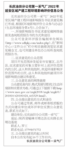 长庆油田分公司第一采气厂2022年延安区域产建工程环境影响评价信息公告