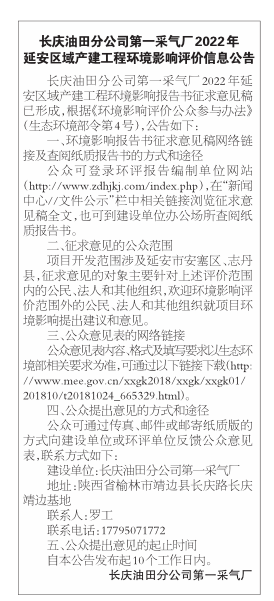 长庆油田分公司第一采气厂2022年延安区域产建工程环境影响评价信息公告