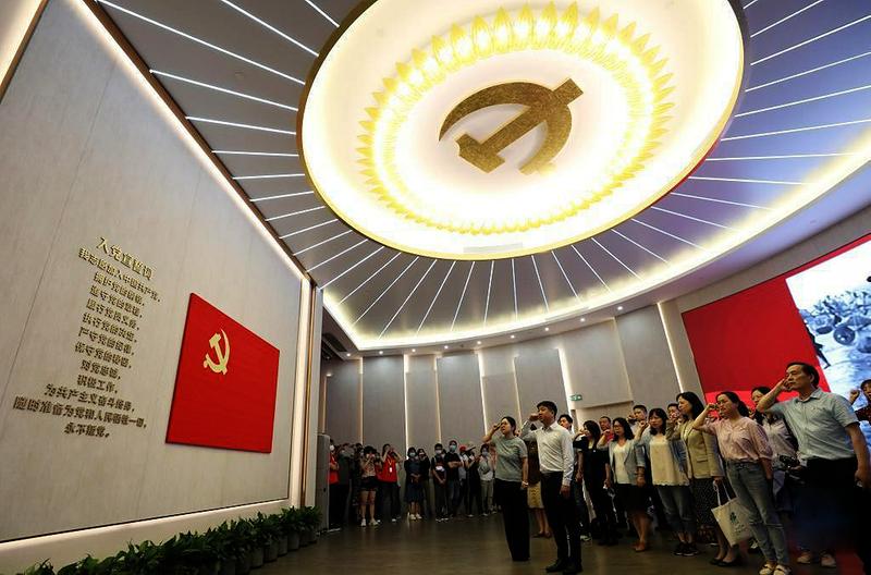 党员在上海中共一大纪念馆里重温入党誓词(2021年6月3日摄)。刘颖 摄