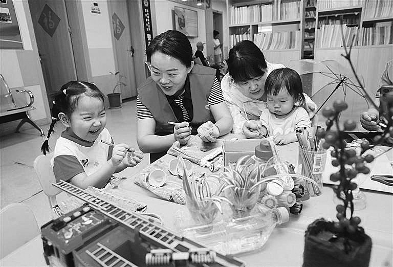 图为社区志愿者和小朋友一起制作环保手工艺品。 李明 摄