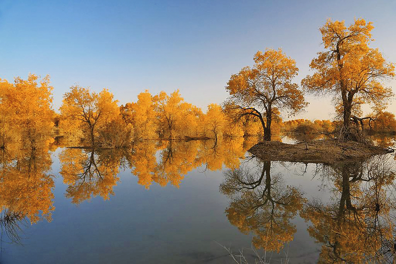 金秋时节,天山南麓的塔里木河流域渐渐褪去青翠,披上金色的外衣。金色的夕阳下,远处的沙丘映着连片的胡杨,连水面上都是一片波光粼粼的金色。
