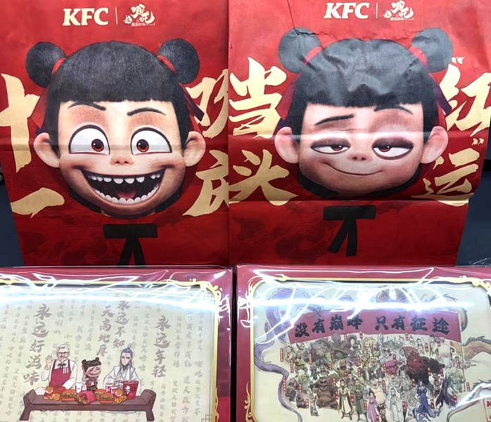 与孙宇弘一样,在这个国庆中秋“双节”期间,西式快餐连锁品牌肯德基与电影《哪吒之魔童闹海》联名推出的“红运盛宴”成了很多人的“打卡新宠”,天津多家门店“变身”哪吒主题餐厅,不少小朋友“Cosplay”成电影中哪吒的形象前来打卡。
