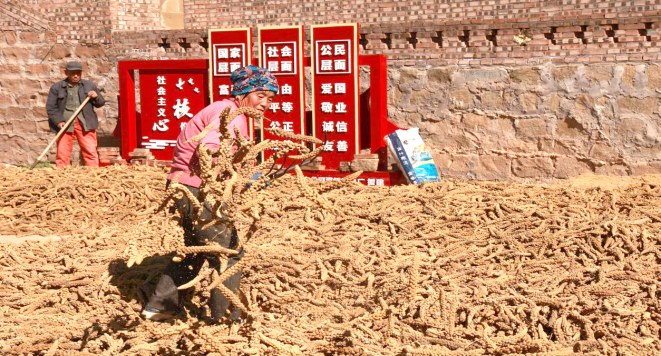 在米脂县的一处农田里,70岁的老农老高站在自家谷子地旁,满是皱纹的脸上洋溢着丰收的喜悦。他轻轻抚摸着饱满的谷穗,感慨地说:“你瞧瞧这谷子,穗头又大又沉,颗颗饱满,今年又是一个好收成。”老高见证了米脂小米种植方式的巨大转变。