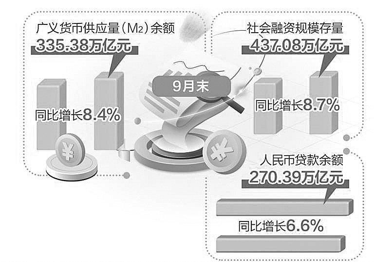 9月末,M2余额335.38万亿元,同比增长8.4%,在上年同期高基数背景下,仍保持较高增速;社会融资规模存量437.08万亿元,同比增长8.7%,比上年同期高0.7个百分点;前三季度,社会融资规模增量累计为30.09万亿元,同比多增4.42万亿元。