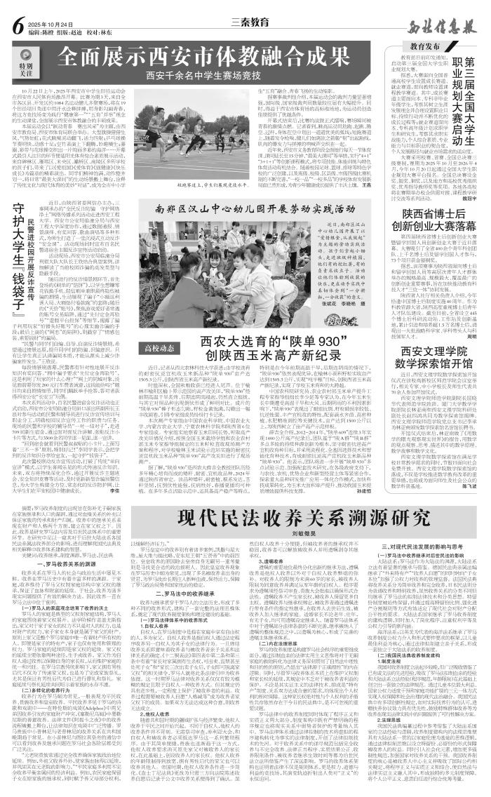 近年来,西安市义务教育阶段全面推行每天一节体育课、课间延长至15分钟、“最美大课间”等举措,实行“4+1”“3+1+1”等创新课程模式,将专项技能、体能训练与特色体育活动有机结合。随着校园足球、篮球、排球等特色学校的广泛创建,以及班级、校级、区县级、市级四级比赛机制的不断完善,“一校一品”“一校多品”的学校体育发展新局面已然形成,为青少年健康成长提供了丰沃土壤。王燕