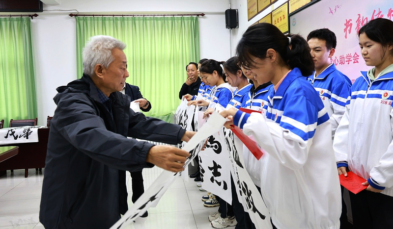 近日,著名老航天公安书法家马士琦先生在耀州中学爱心助学会上,为15名学习标兵每人书赠题有其姓名的励志寄语、成长箴言书法作品一幅,鼓励学子积极进取。