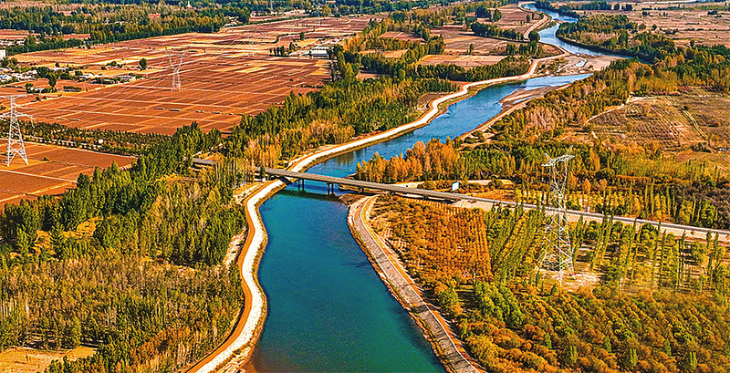 秋日暖阳下,俯瞰甘肃省张掖市临泽县,红黄绿交织的彩色森林如大自然铺就的锦绣地毯,在巴丹吉林沙漠边缘勾勒出一幅生机盎然的生态画卷。