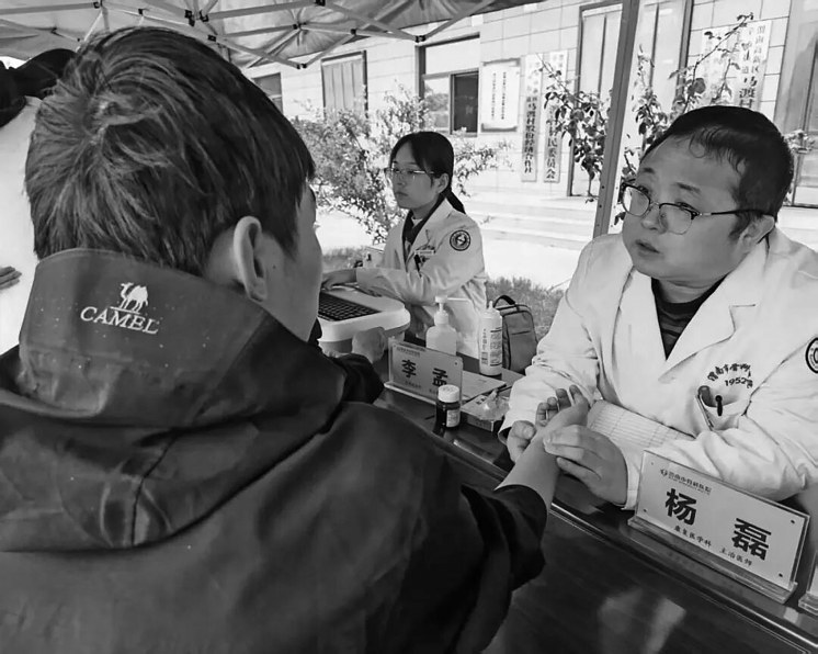 活动现场,渭南市骨科医院院长李博带领临床专家和医护人员,耐心为村民提供健康咨询与疾病解答,细致回应老人们在骨病防治和日常保健方面的疑问。医护人员携带骨密度检测仪、血压仪及康复医学科专用的AI指诊仪器,持续为老人监测血压、血糖及相关身体指标,辅助评估身体机能。