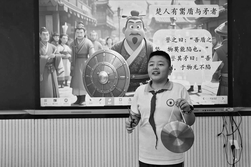 定边县新乐小学的语文课堂上,同学们正在模拟古人卖货的场景。“那个楚国人卖矛和盾的时候,我就在现场!我还问他:‘用你的矛攻你的盾,会怎样?’他答不上来,脸都红了!”近日,在定边县新乐小学,六年级学生张昊东兴奋地回忆着刚才的语文课。这不是普通的课堂,而是一场通过AI技术实现的“穿越之旅”——孩子们“穿越”到古代楚国集市,亲眼见证了《自相矛盾》寓言故事的发生。