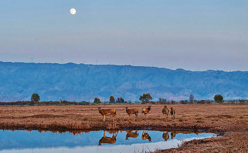 青铜峡库区湿地自然保护区总面积174.93平方公里,是宁夏最大的黄河滩涂类型湿地。2024年9月底,35头麋鹿落户青铜峡库区湿地自然保护区,经过一个月适应期后被野放在200余亩的围栏内。目前,随着6只麋鹿幼崽的诞生,当地麋鹿种群繁育工作迈入新阶段,放归区域从200余亩扩展至3000余亩,保护工作也从迁地扩繁转向野化放归,开启了黄河流域宁夏段生物多样性保护的新篇章。