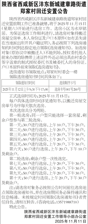 陕西省西咸新区沣东新城建章路街道郑家村回迁安置公告
