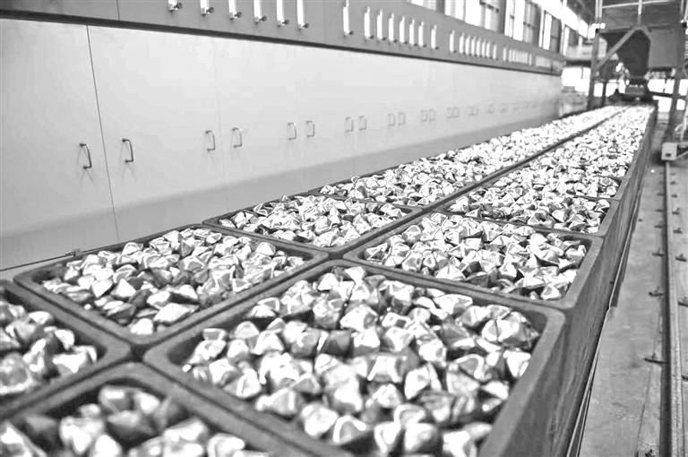 陕西中钒昌盛新材料科技有限公司自动化生产线上的一筐筐银灰色钒氮合金。近日,在位于商南县试马镇的陕西中钒昌盛新材料科技有限公司的车间里,自动化生产线有序运行,金属轨道上运送着一筐筐银灰色的制品——钒氮合金。
