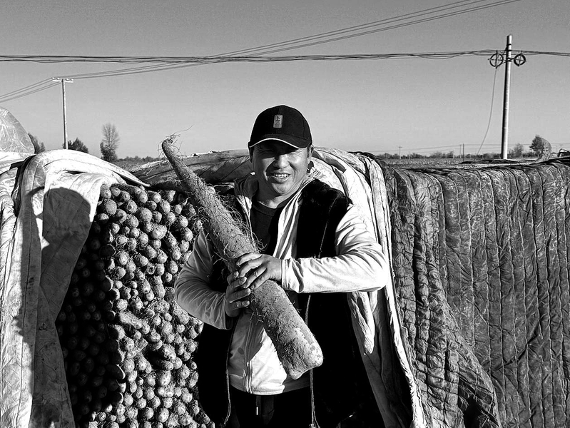 在种植户王立山的山药承包地,大型挖掘机穿梭田间,铁铲深入土层,精准翻挖后,一根根粗壮饱满的山药破土而出。工人们紧随其后,熟练地将山药捡拾、清泥、码放,等待装车销售。