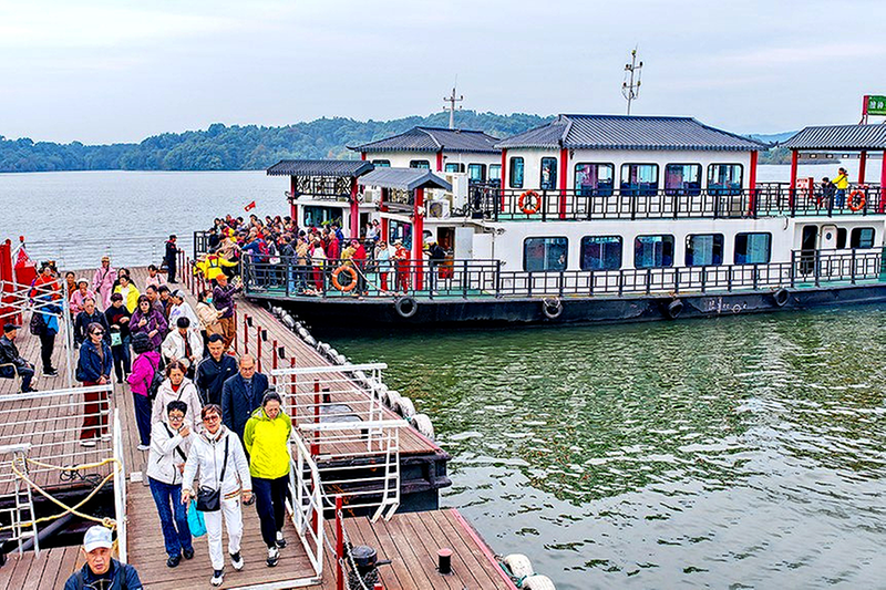 近日,江西省新余市仙女湖景区,许多中老年游客乘船前来游玩。