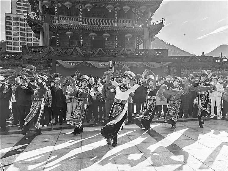 每年农历十月初一是羌族的传统新年。今年11月20日是羌年被列入人类非物质文化遗产代表作名录后的首个羌年。图为当日,略阳县群众载歌载舞,庆祝羌年。
