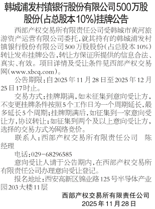 韩城浦发村镇银行股份有限公司500万股股份(占总股本10%)挂牌公告
