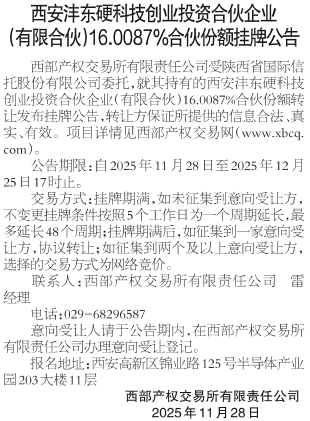 西安沣东硬科技创业投资合伙企业(有限合伙)16.0087%合伙份额挂牌公告
