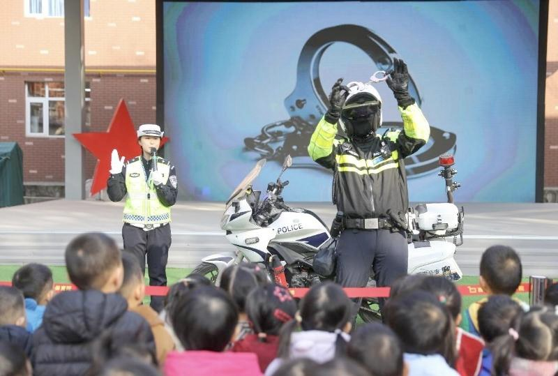 活动现场瞬间变身“交通安全小课堂”,民警沈李影结合幼儿认知特点,用生动形象的语言将红绿灯、斑马线等交通标识讲得妙趣横生。她化身“手势教练”,手把手教孩子们练习停止、直行、转弯等标准交通指挥手势,孩子们挺胸抬头、认真模仿,一招一式有板有眼,在趣味互动中轻松解锁交通指挥技能。随后,沈李影带领孩子们传唱交通安全拍手谣,欢快的节奏回荡在校园,朗朗上口的歌词让交通安全知识“声”入人心。 张佳