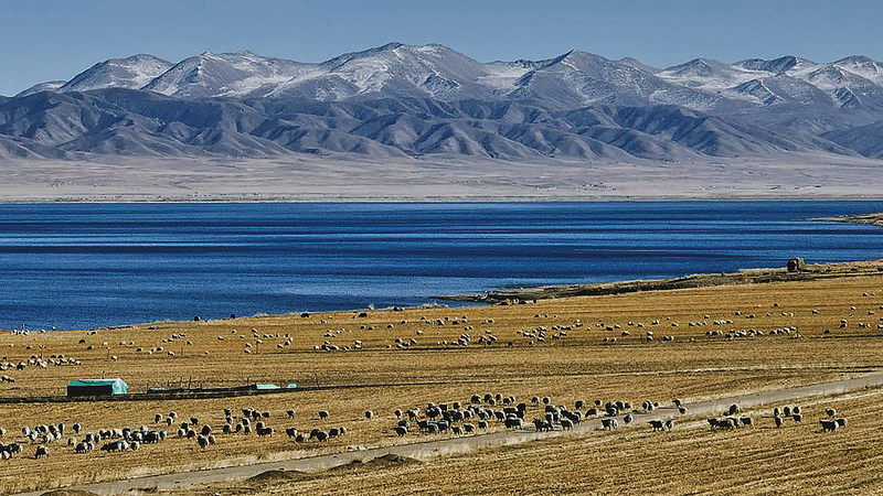 冬日,在青海省海南藏族自治州共和县江西沟镇附近的青海湖湖畔,牧民赶着羊群在这里放牧,湛蓝的湖水与羊群相映成景,绘就一幅冬日牧羊图。