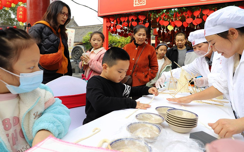 在永兴坊,吴堡手工空心挂面非遗传承人指导小朋友体验挂面制作技艺。近日,承载着陕北民俗与非遗智慧的吴堡手工空心挂面非遗传承万人宴走进西安永兴坊、永宁里、大唐不夜城等核心地标,践行“非遗+文旅”“非遗+电商”融合发展模式,展示非遗技艺,吸引更多游客关注吴堡手工空心挂面。