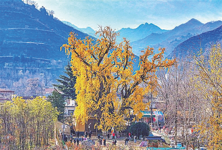 近日,当西安多数银杏树已落尽残叶时,长安区子午街道天子峪口百塔寺内,植于西晋、树龄约1700年的古银杏树,正以满树“鎏金”开启初冬的“压轴浪漫”。这棵以“晚熟金黄”而闻名的古银杏树,树冠如撑开的金伞,30余米高的枝干间,扇形的树叶裹满蜜蜡般的黄色,吸引了众多游人用镜头记录这份终南山下的初冬限定盛景。
