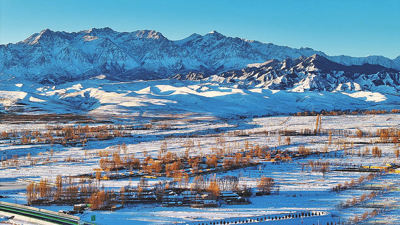 冬日,位于祁连山下的甘肃省张掖市民乐县迎来一场降雪。雪后初霁、阳光洒落,整齐的村舍、辽阔的田畴与层峦叠嶂的山峰相映成景,宛如一幅清逸的水墨长卷。