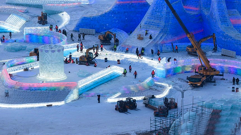 目前,园区内各类冰建景观已基本成型。错落的冰城堡、巨型冰雕群被霓虹灯光晕染出蓝、紫、红、绿等斑斓色泽,施工人员正有序开展最后的细节雕琢与灯光调试作业,现场工程机械有序的进行清洁整理等收尾作业。届时,游客将能正式踏入这座冰雪艺术的乐园,体验冬日独有的梦幻氛围。
