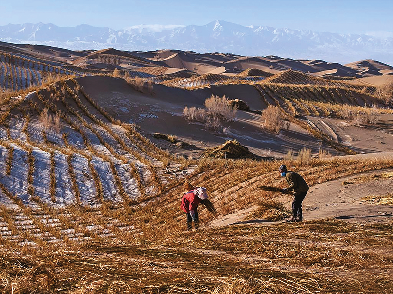 一场冬雪过后,在甘肃省酒泉市阿克塞哈萨克族自治县的库姆塔格沙漠边缘,施工人员忙着铺设沙障,有序推进甘肃省酒泉市祁连山北麓阿克塞片区水源涵养与生态保护修复项目。该项目总规模22.2万亩,包括工程固沙、封滩(沙)育林、人工造灌木林等防沙治沙项目。