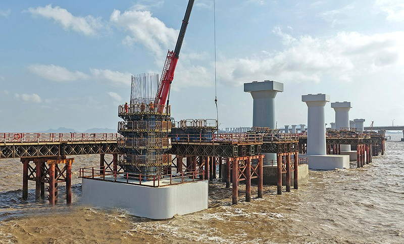 近日,浙江省临海市头门港铁路跨海大桥项目建设现场,工人正抓紧施工,全力冲刺年度目标任务。