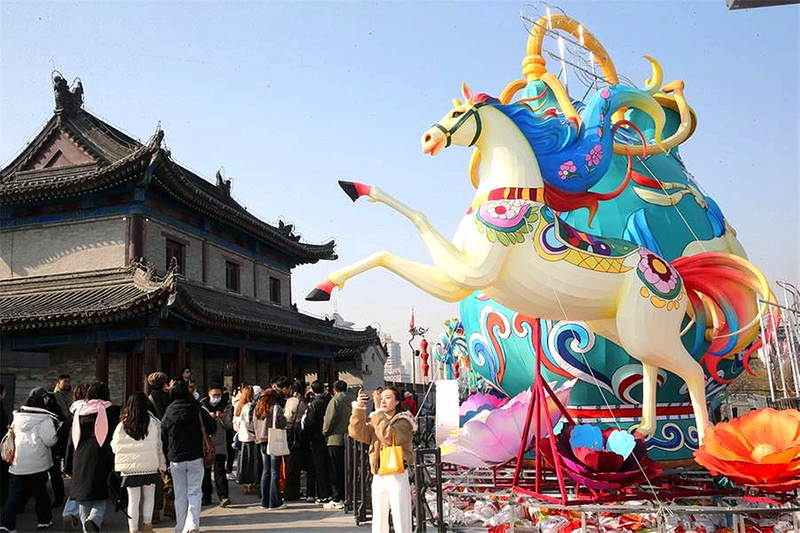 西安城墙景区工作人员李佳洁告诉记者,“国宝焕新颜”是本届灯会的一大创新亮点。活动联合西安及关中地区多家知名博物馆,精选三彩腾空马、昭陵六骏、乾陵翼马、舞马衔杯纹银壶等50余件国宝级文物,让“深居”博物馆的历史瑰宝走出展柜、亮相城墙,成为“文物活化”的展示窗口。以匠心独运的花灯造型实现“文物复刻”,配合城角光影投影秀以及博物馆联动互动体验,构建起“文物+科技+体验”的文旅场景,将静态的历史文物转化为灵动的光影艺术,游客站在城墙之上,就能与千年国宝开启一场跨越时空的“光影对话”。
