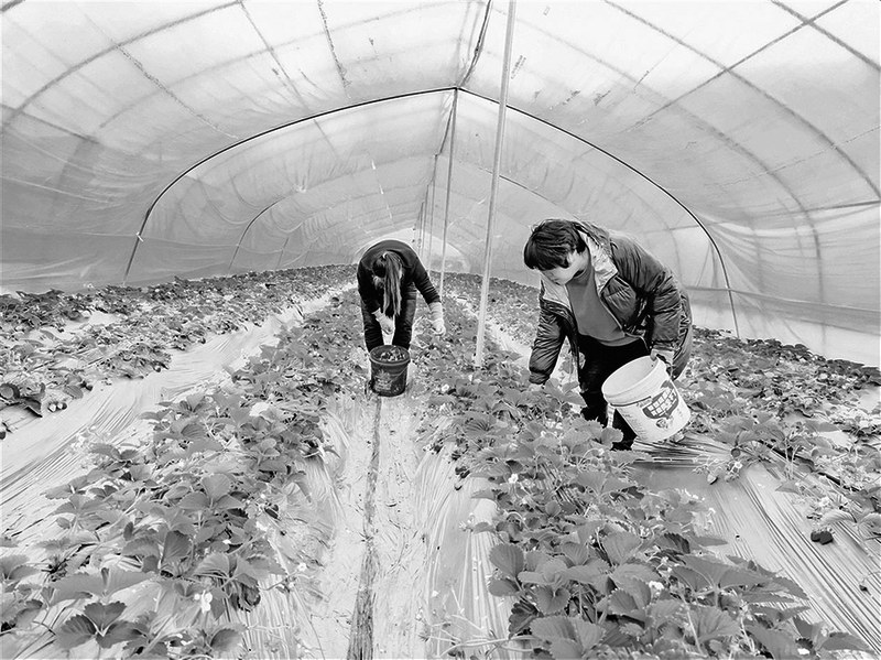 近日,旬阳市蜀河镇三官社区30亩温室大棚草莓采摘园内,群众正在采摘草莓。