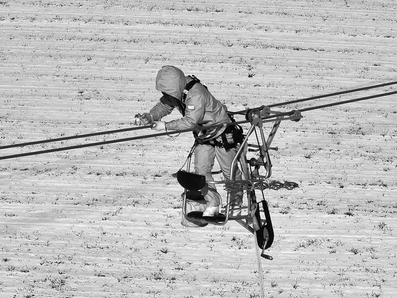 作业前,负责人召开班前会,全面讲解触电、高坠、低温等多重风险;作业现场划分指挥、操作、监护等专项区域,安全警示标识清晰规范,人员分工明确、责任到人。本次作业采用“无人机+小飞人”的方法更换覆冰在线监测装置。无人机操作员率先操作无人机将自动升降装置的主绳与后备保护绳精准挂设至工作相不同子导线,形成双重安全防护;高空检修人员乘坐自动升降装置快速升空,伴随电弧“滋啦”的放电声,仅用数十秒便稳稳抓住导线,顺利进入强电场。相较于传统登塔、软梯等登高方式,效率提升近80%。